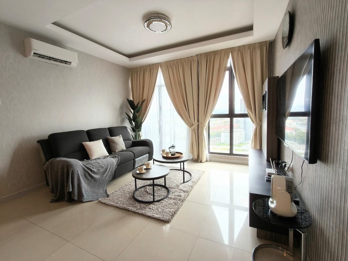 Explore our cozy studio, which can accommodate 2 to 3 people with a queen bed and a sofa bed. Only a 15-minute drive from KLIA T1/T2, the place is surrounded by many restaurants, fast food branches, groceries, and laundry shops, all within walking distance. Savor all the amenities, including the kids’ playground, BBQ area, gym, and swimming pool, with 24/7 security. * Unavailable drop your luggage before check in hours.Due to building designed, need to walk 10 steps staircase to get elevator.