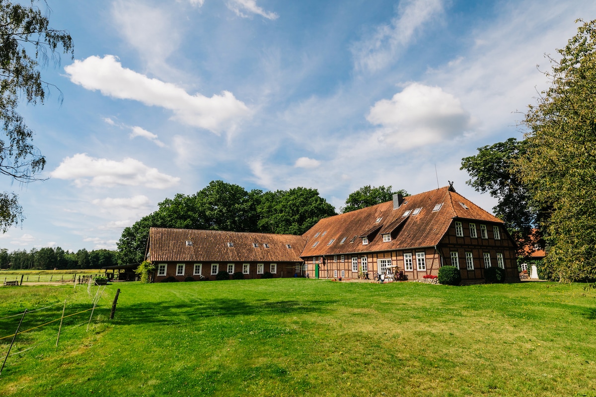 Die Ferienwohnung liegt landschaftlich schön am südlichsten Rand der Lüneburger Heide in Nähe des Heideparks, des Safariparks und des Weltvogelparks und befindet sich im Dachgeschoss meines kleinen Fachwerkhauses. Es gibt einen grossen Garten mit Obstbäumen, Sitzgruppen, Liegestühlen und Hängematte. Die Umgebung läd ein zu ausgiebigen Spaziergängen und Fahrrad- oder Bootstouren auf Aller und Leine.