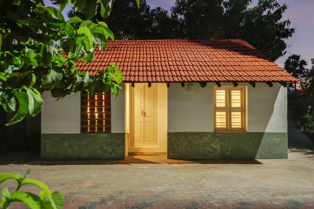 The earthen hut, located amidst the cashew orchard, is a unique pioneer-style hut made of wood, mud, and coconut leaves, using completely sustainable materials. It features a curated open-hut design surrounded by lush greenery, offering guests a unique living experience. The hut includes a kitchen, a separate standalone bathroom, and a pebble-paved patio with seating areas for enjoying coffee! The best corner is the balcony, which offers the guest to witness the sunset, sunrise and stargazing.