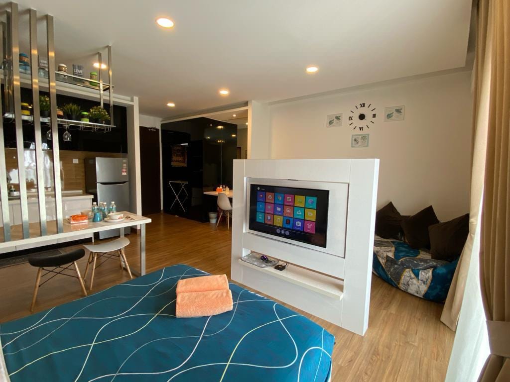 A cosy duplex on the highest floor of the building (Level 21), with a queen bed and a 3-seater sofa. Suitable for both short- and long-term stays. The building is in De Centrum Mall, with shops such as Super7 (supermarket), Mr. DIY, Watsons, and 7-Eleven among others, and facilities like launderettes and a clinic (Poliklinik MyMedik). •Check in time: from 3PM •Check out time: 12PM