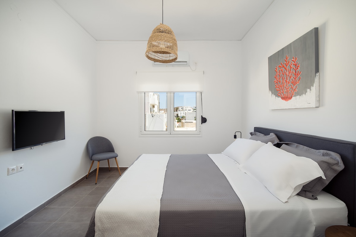 Experience the magic of the Cyclades in our delightful seafront apartment, boasting panoramic views of the picturesque Cheronissos Bay. With space for up to 6 guests, our luxurious haven offers two elegant double bedrooms, a welcoming open-concept living room, a fully-equipped kitchen, and a sleek bathroom. Unwind on the charming balcony as you take in the stunning vista of crystal-clear waters and charming fishermen's boats – a truly serene and authentic Greek island experience awaits you!