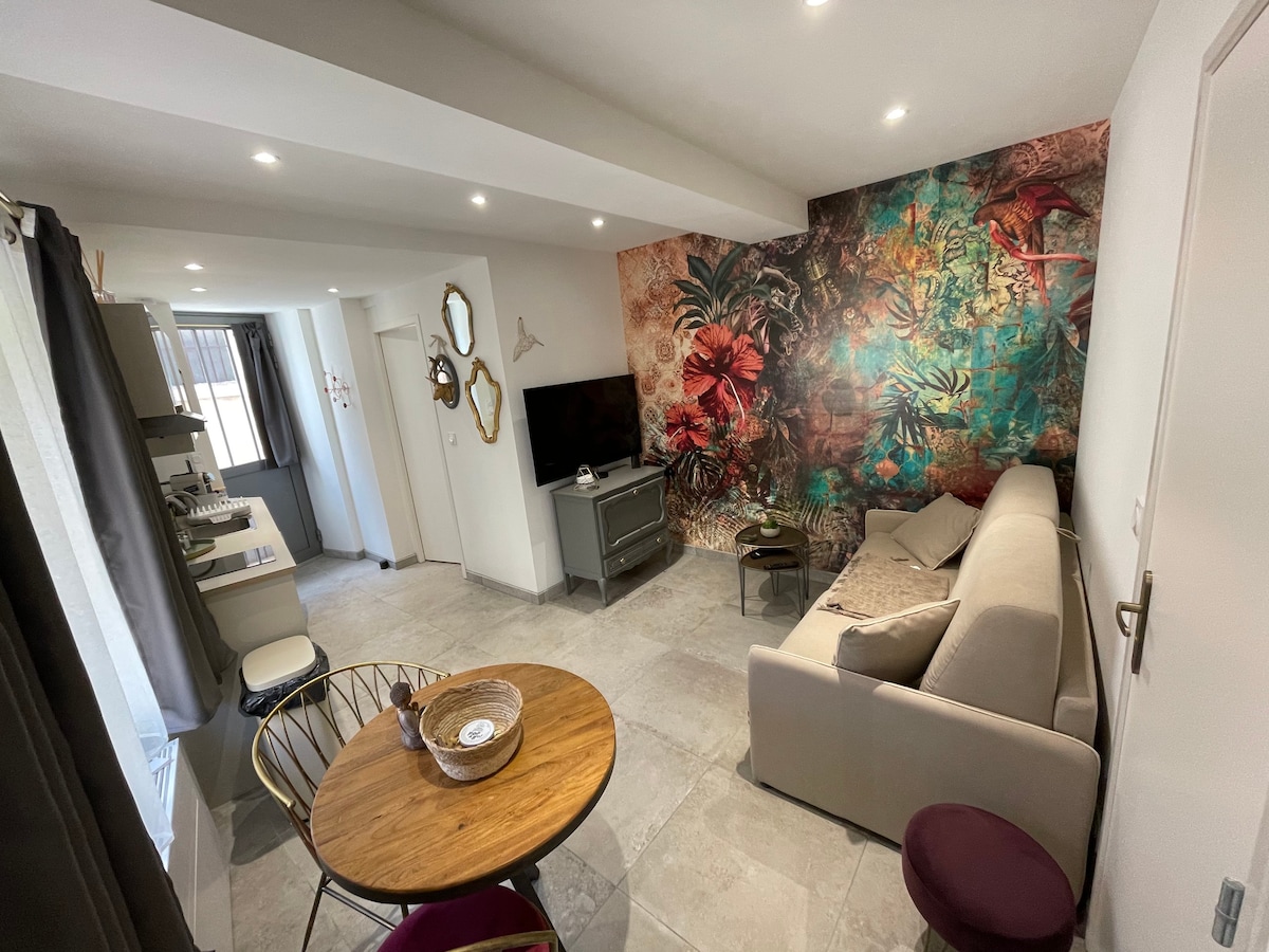 Notre logement situé en plein cœur de la principale rue piétonne de Valras saura vous séduire par sa facilité d’accès aux commerces,à la plage et au port à 200m. Il est positionné au 1er étage sans ascenseur d’une résidence de 2 étages. A l’intérieur de notre logement aménagé avec amour et climatisé, vous y trouverez: - une pièce à vivre avec cuisine équipée,canapé, TV. - une chambre lit 140 - une SDB, douche, lavabo, WC Parking gratuit du 15/09 au 15/06 à proximité.