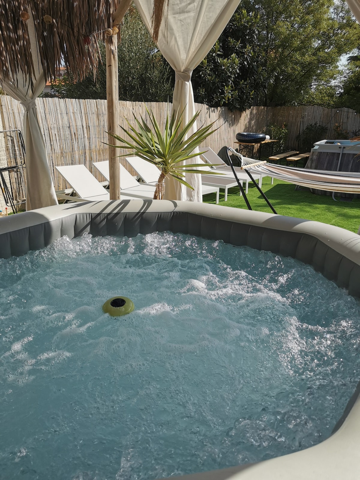 Notre logement de 30m2 offre une pièce de vie équipée d'une baignoire balnéo premium, 22 jets d'hydromassage et d'un lit KING SIZE. Jardin privatif sans vis à vis équipé d'une table et d'un parasol. Entrée indépendante via digicode. Cuisine séparée avec four micro ondes, réfrigérateur, cafetière senseo , plaque vitrocéramique... Tv écran plat en wifi Salle de bain avec douche WC séparé Parking sécurisé sur terrain clos Calme, détente, soleil...