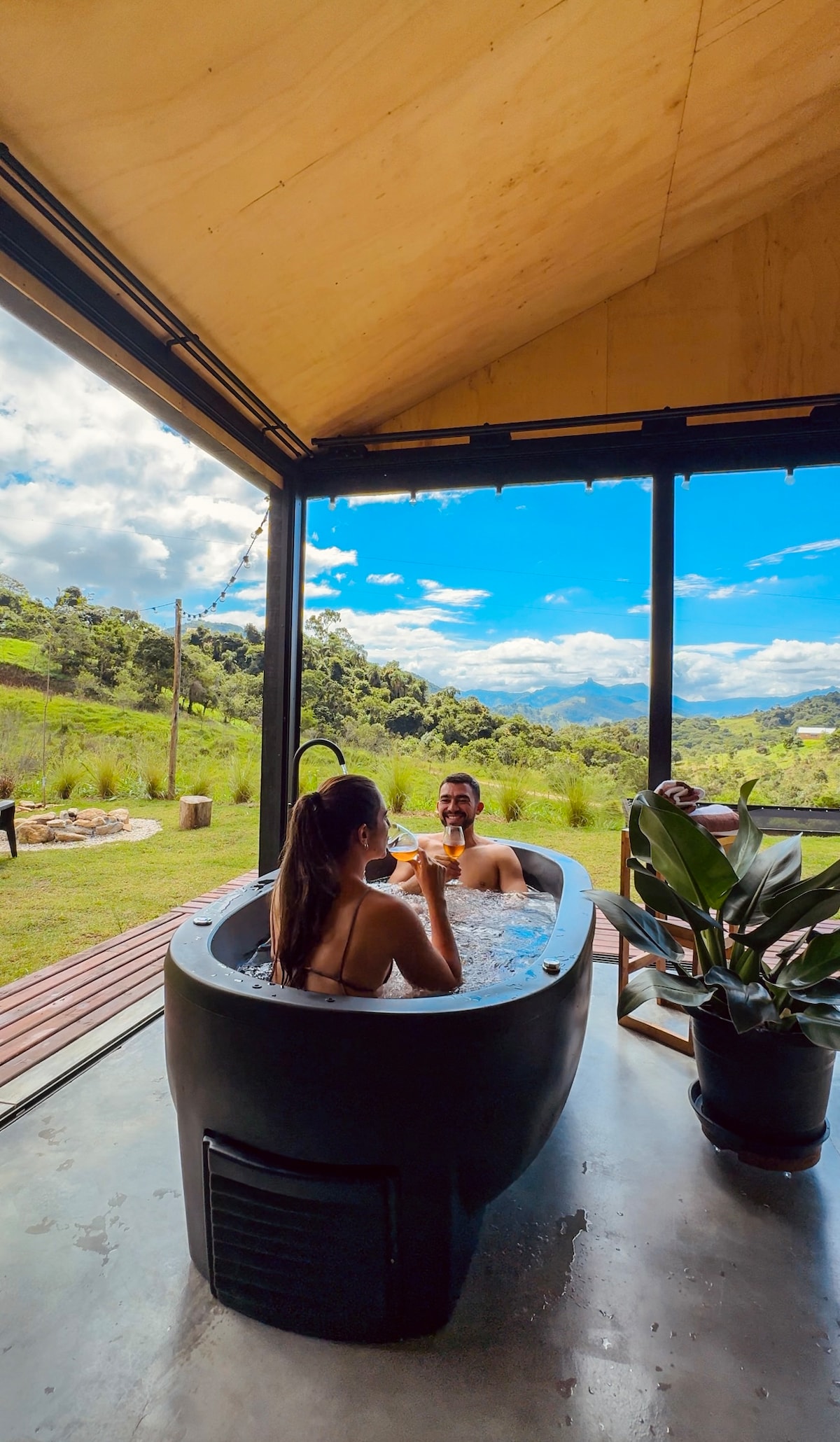 Stone Ark with a unique design, featuring a Mykonos-style mini-pool + hydro, lighting, sound, comfort, and sophistication, floating above the mountains of Gonçalves. Enjoy the stunning sunset, the magnificent starry sky, and stroll through the lush fields of the Green Mountains of Minas Gerais. “Experiencing Mont Sha’n is unique and inspiring: a journey of reconnection and energy renewal, with a strategic location for lovers of ecotourism, gastronomy, trails, and waterfalls.” 👇🏻