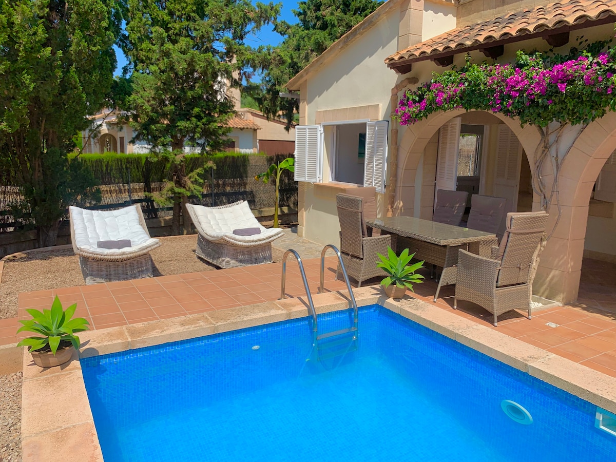 Encantadora e íntima casa a 10 min. de Palma con 7000m2 de Jardin, piscina, Jacuzzi exterior climatizado y precioso jardín. Consta de 3 dormitorios y 2 baños .Dispone de gran terraza con vistas al jardín, porches, chimeneas, barbacoa, aire acondicionado y calefacción…Muy amplio y cómodo. Zona tranquila a 7km del centro de Palma, aeropuerto y playas. Supermercados a 1km. Ideal para descansar, excursiones por la isla, ciclismo etc...Nos encantan las mascotas, así que tráetela ;-)