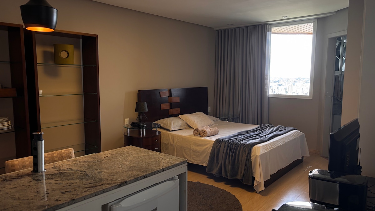 Com 70 m2 , para quem quer privacidade e independência . Na Savassi à duas quadras da Praça da liberdade e do Shopping Pátio Savassi. Com uma suíte, banho reversivel social , sofa cama para hospedes, janela da suíte antiruídos, ar condicionado quarto e sala, wifi300 megas, smartv de 75 polegadas , Hometheater, cozinha completa , microondas, serviço de quarto, camareira, manobrista, piscina , academia, sauna, restaurante e portaria 24horas.