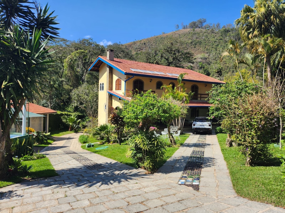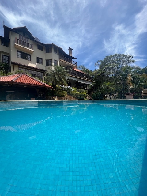 Casa de 400 m2 em área com acesso controlado por guarita, com a paz e tranquilidade que a região serrana de Teresópolis pode proporcionar e inúmeras atividades de lazer, dentro e fora da propriedade Piscina, churrasqueira, forno de pizza, mesa de carteado e jogos de tabuleiro, mesa de sinuca e telão para assistir filmes em diversos "streamings" e para assistir seu jogo esportivo favorito. TVs nas 5 suites da casa e na sala de estar. Trilhas e cachoeiras dentro e fora de parques nacionais.