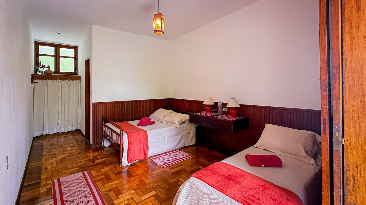 Suíte aconchegante em casa simples próxima ao Centro Histórico, porém em local silencioso e rodeado de verde. Entrada independente e banheiro privativo, conta com cama de casal, guarda-roupa, ventilador, frigobar, microondas e sanduicheira além de wi-fi e netflix. Rua tranquila para deixar o carro.