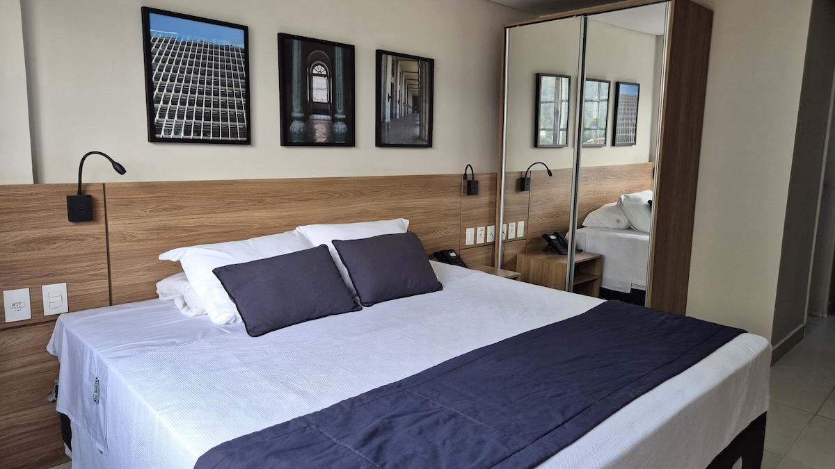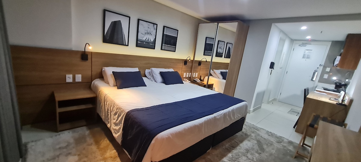 Apartamento suíte completa com ar-condicionado, chuveiro com aquecimento central, mini cozinha, vista para a reserva. Wi-Fi gratuito, TV smart, a cabo e itnernet, Youtube etc. O espaço não precisa de um detector todos os aparelhos são elétricos (incluindo aquecedores de água), e não há lareira ou garagem anexa. O Flat - Pau Brasil dispõe de estacionamento gratuito, recepção 24 horas. No local piscinas ao ar livre aquecidas e não aquecida, sauna, academia, spa, bar, restaurante etc.