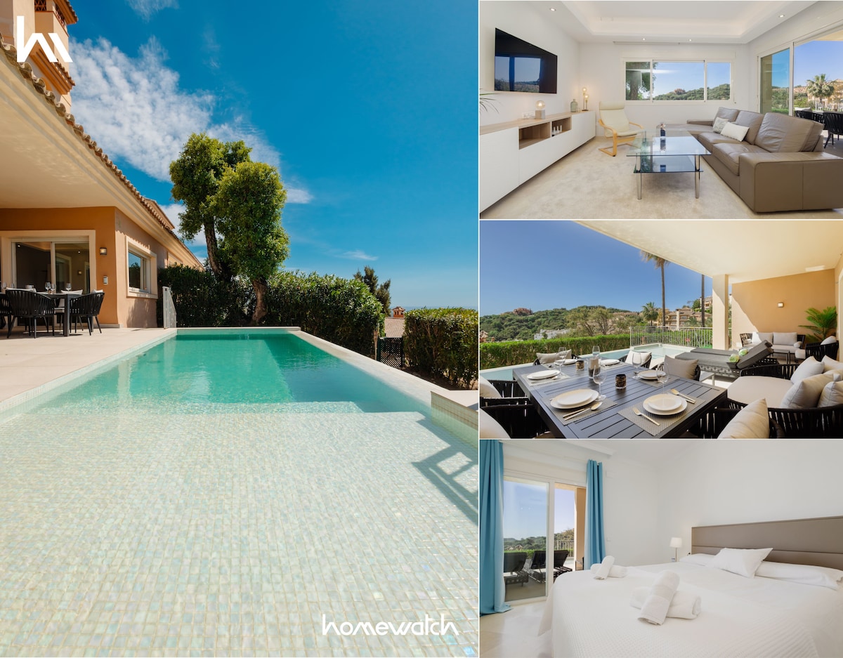 Luxurious holiday home in the beautiful gated community of El Vicario, with a private garden, heatable private pool, and stunning sea views, next to El Soto golf club in La Mairena, Elviria, just 6 km from the coast and beach. The pool can be heated to 30° for an additional cost of €20 per night. Featuring 3 bedrooms, 3 bathrooms, a spacious living and dining room, fully equipped kitchen, covered terrace, and private garden.