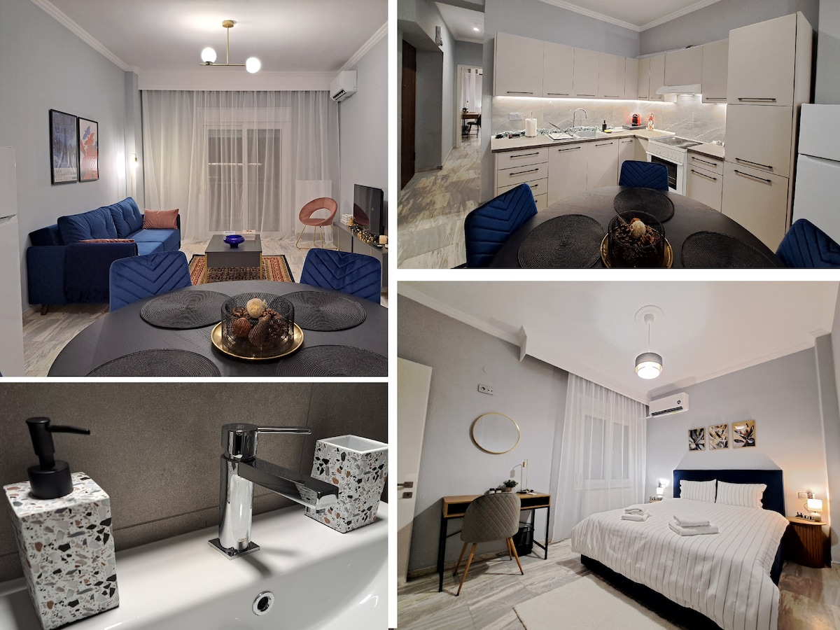 Διαθέτει 2 κρεβατοκάμαρες ,σαλόνι με 50άρα Smart TV (Netflix), κουζίνα, τραπεζαρία και μπάνιο. Parking και WiFi. Βρίσκεται δίπλα σε πάρκο και απέχει 900μ. από το κέντρο. Παρέχουμε υπηρεσίες φύλαξης παιδιών! καλέστε μας η στείλτε μήνυμα. 2 bedrooms, a living room with 50s Smart TV (Netflix), a kitchen and bathroom. Also parking and Wi-Fi. Located near a park and it is 900m from the center. We provide babysitting services! call us or send a message.