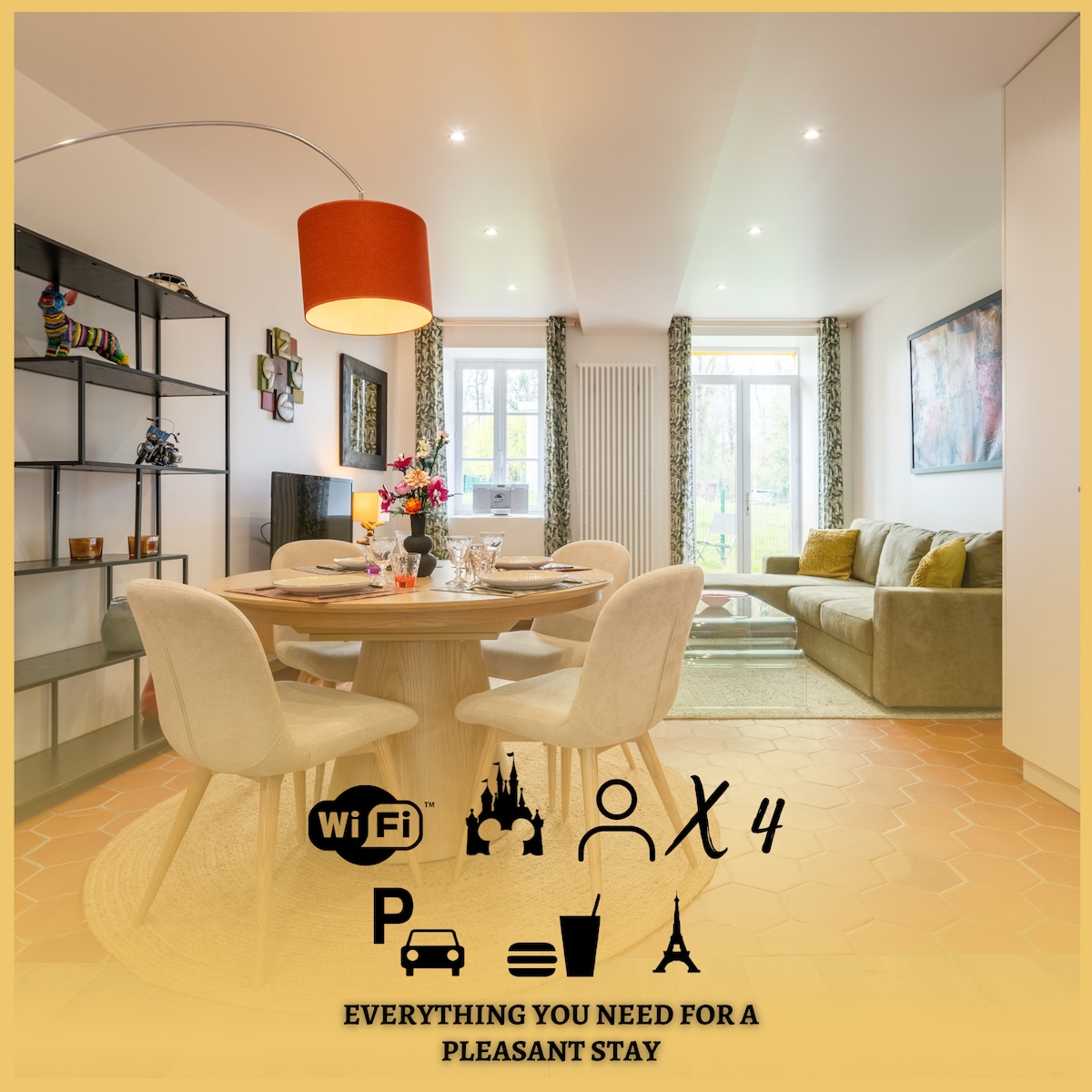 Charmante maison, idéale pour un séjour près de Disneyland Paris (5 km). Située dans un quartier paisible, avec transports publics à 200 m. Parking privé et accès autonome pour plus de confort. Entièrement équipée, elle offre un confort haut de gamme pour un séjour parfait jusqu’à 6 personnes. Profitez de la tranquillité tout en restant proche des principales attractions touristiques.