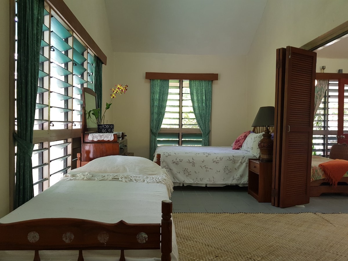 A two bedroom, two bathroom home with AC, located in Maui Bay on the Coral Coast of Fiji. Situated on a hill, just minutes from the beach (2 min drive), you can enjoy both amazing ocean views and the cool trade winds. Our caretaker will greet you upon arrival and provide housekeeping Mon-Fri 9-4:00PM. She can also babysit, accompany you shopping, as well as cook curries and fresh roti which many guests have her teach them how to make themselves. Free WIFI and a water filtration system.