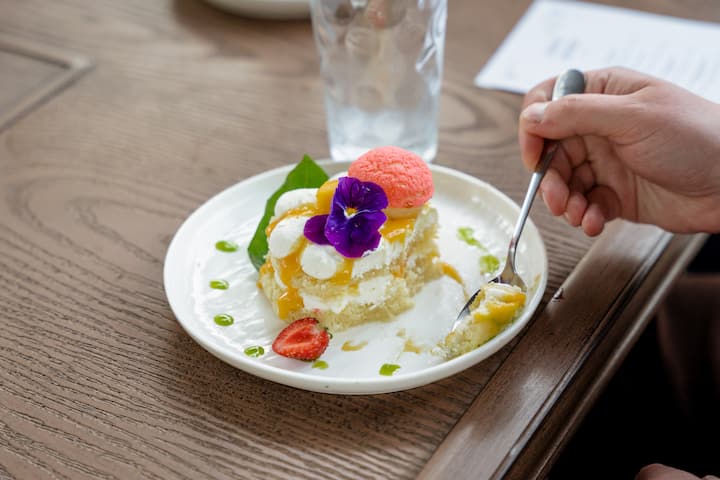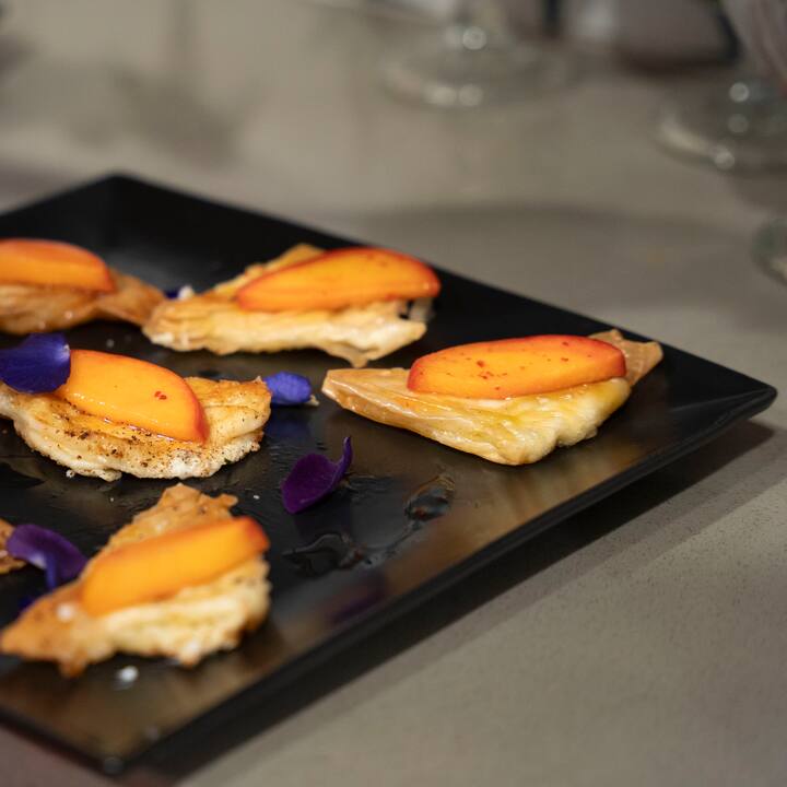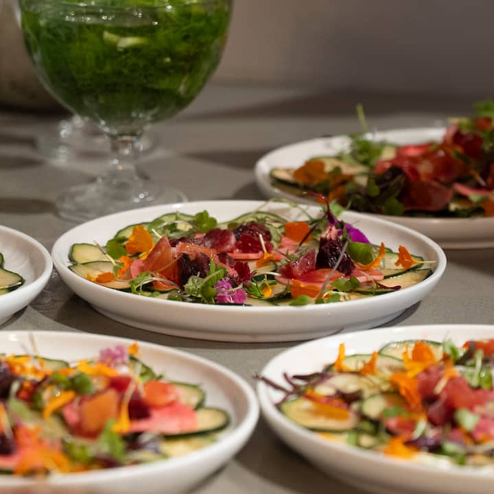 享用前菜、开胃菜、主菜和甜点,依次上菜。 典型的菜单可能包括芝麻菜沙拉配炸山羊奶酪、珍稀番茄和柠檬油醋汁;酥皮咖喱角配蜜桃泡菜和里考塔奶酪;接着是金色桃红酱汁意面,最后是百香果焦糖布丁甜点。 包括准备、餐具和清洁。