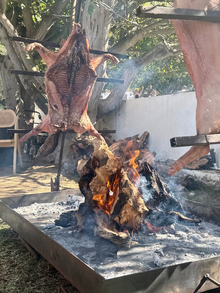 体验终极阿根廷烤肉盛宴:我们的全猪盛宴,25磅猪肉在明火上慢烤数小时,直至完美柔软酥脆。 享用手工制作的开胃菜、时令火烤配菜和美味甜点。 非常适合 10 位以上的房客聚会,这是对风味、传统和火焰烹饪艺术的真正庆祝,在温馨、质朴和令人难忘的环境中享用。