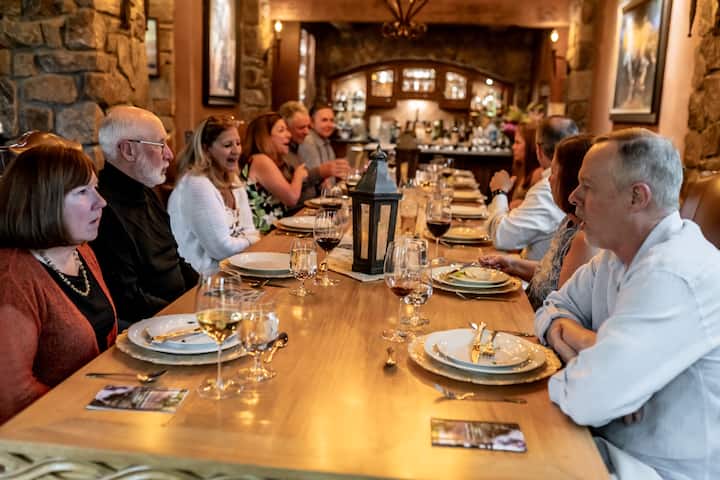 在家用餐,菜单包括汤、沙拉、主菜、甜点和饮料。 此服务需要布置、现场厨师和工作人员。