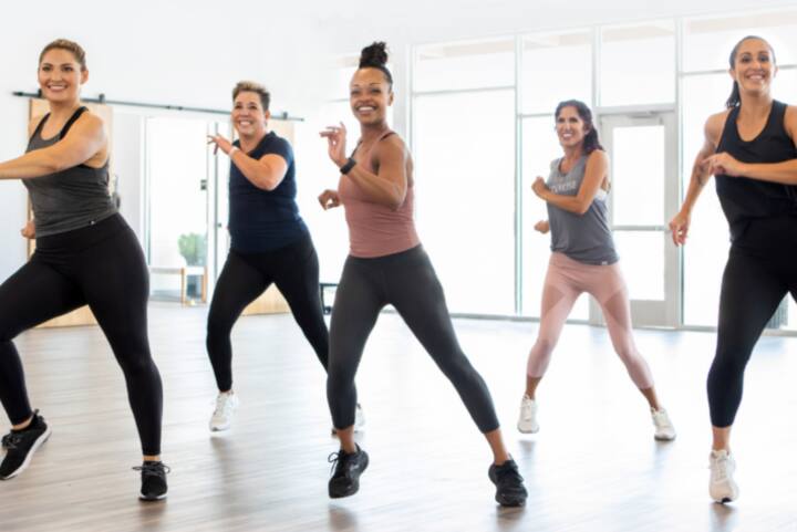 在动感十足的舞蹈有氧课上,随着动感音乐跳舞,同时进行力量训练。