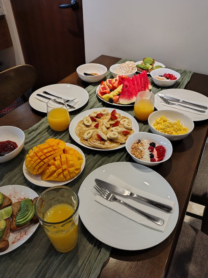 新鲜水果、烤饼、牛油果吐司、炒鸡蛋、酸奶、格兰诺拉麦片、咖啡和果汁