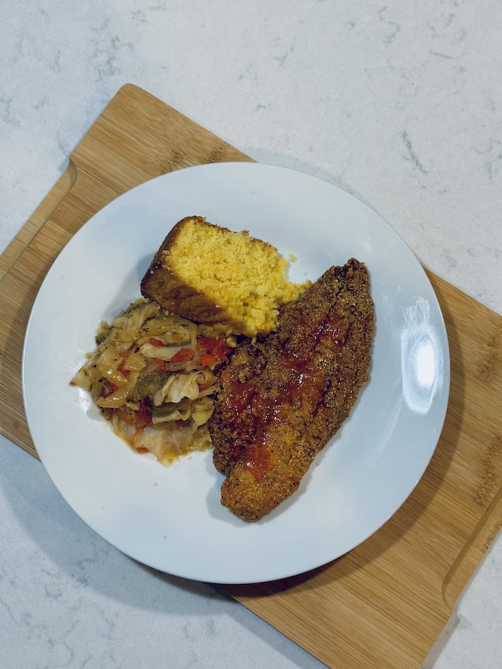 滋养灵魂的东西! 金色炸鲶鱼配自制蜂蜜黄油玉米面包和炒卷心菜。