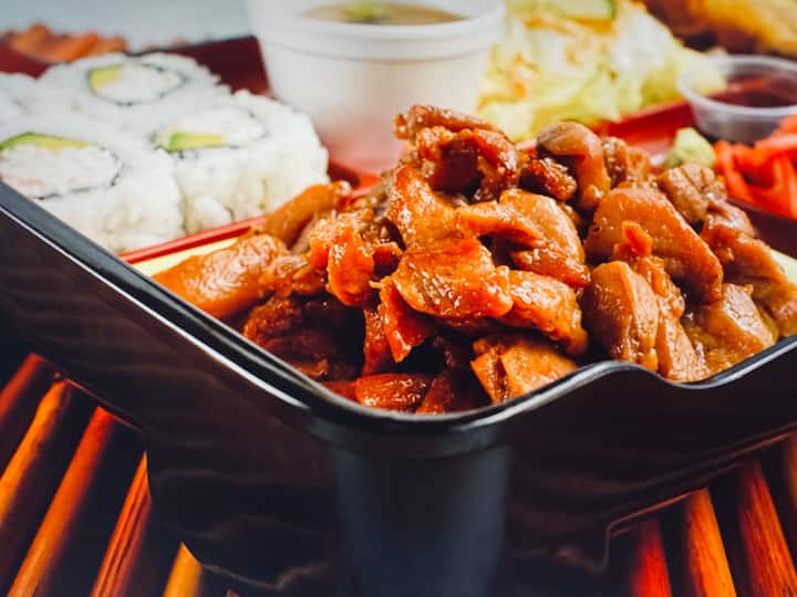 享用精美的便当盒,内含照烧鱼、鸡肉或牛肉、蒸饭、时令蔬菜、脆卷心菜沙拉和 4 个寿司卷。均衡、新鲜、由厨师精心准备,非常适合营养丰富的午餐或优雅的晚餐。