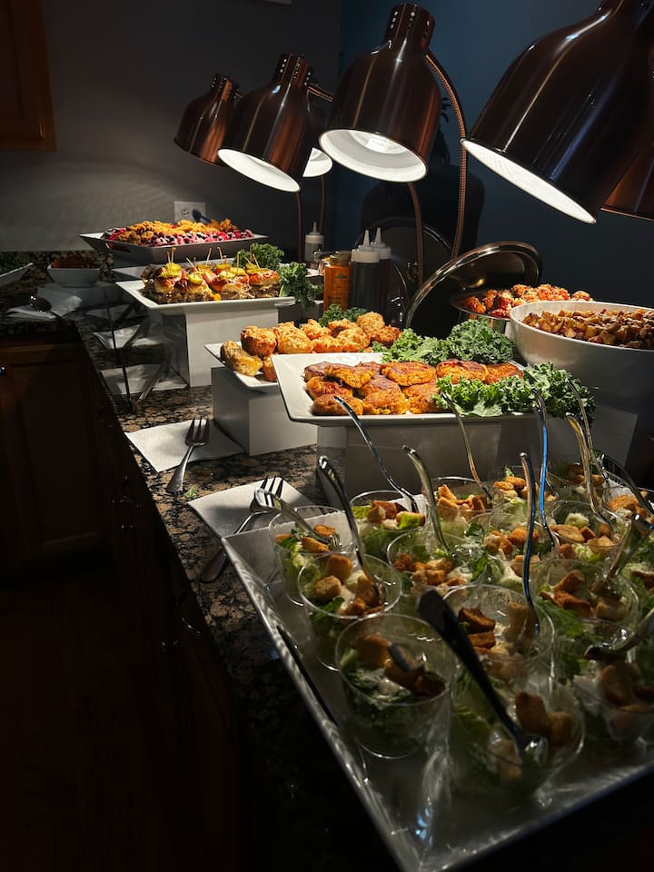物品在场外准备。布置包括热灯、升降器、盘子、保温器和餐具。350美元的布置费。