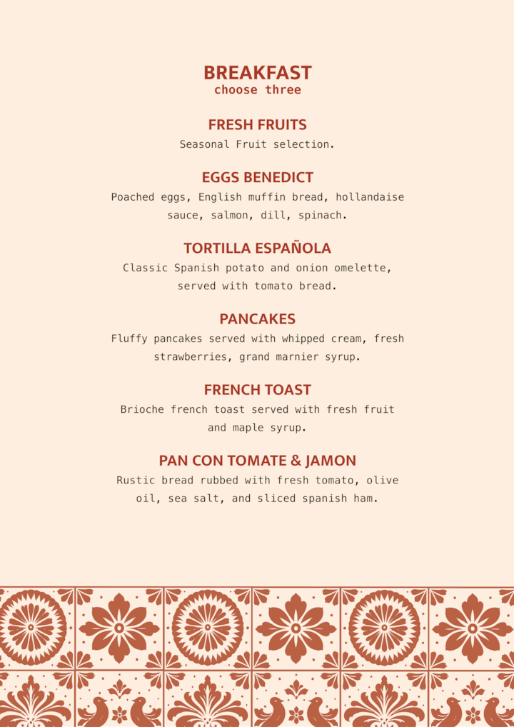 从我们的菜单中选择任何3道菜,提供新鲜的经典西班牙风味。可提供附加服务。