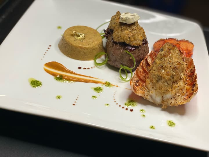 天鹅绒羊肉、麋鹿或鹿肉,配特别芥末籽烤番茄沙拉、黄番茄蒜泥蛋黄酱龙虾配4倍复合黄油菠萝酱扇贝和厨师精选沙拉或汤