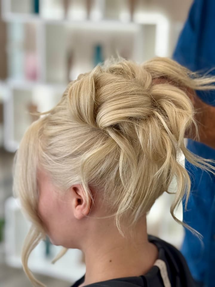 盘发服务包括全面咨询、头发准备(轻微吹干或修饰)、固定、扭转或编发,以及定型,使发型能够保持一整天或一整夜。每款盘发都可根据您想要的造型进行定制,从简洁优雅到柔美浪漫,是婚礼、活动或特殊场合的理想之选。