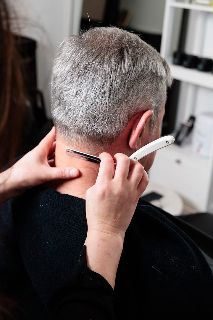 将胡须修剪成形,然后将热毛巾剃须刀沿着脸颊和颈部剃须,在胡须边缘处形成干净清晰的线条。 最后用冷毛巾擦拭并涂抹须后水。