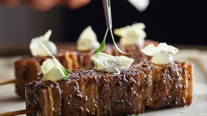 美食之旅从鹿肉鞑靼配芥末和蓝莓开始,然后是羊肩肉和山羊奶奶油(用干草熏制)馅的新月形意大利面。 接下来,您可以选择炖牛颊肉或沙朗牛排,两者都配有黑松露。 最后是黑巧克力、覆盆子雪葩和木槿花粉。