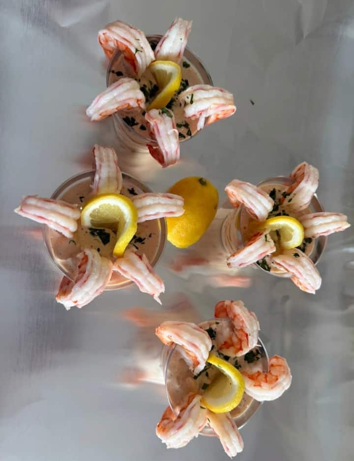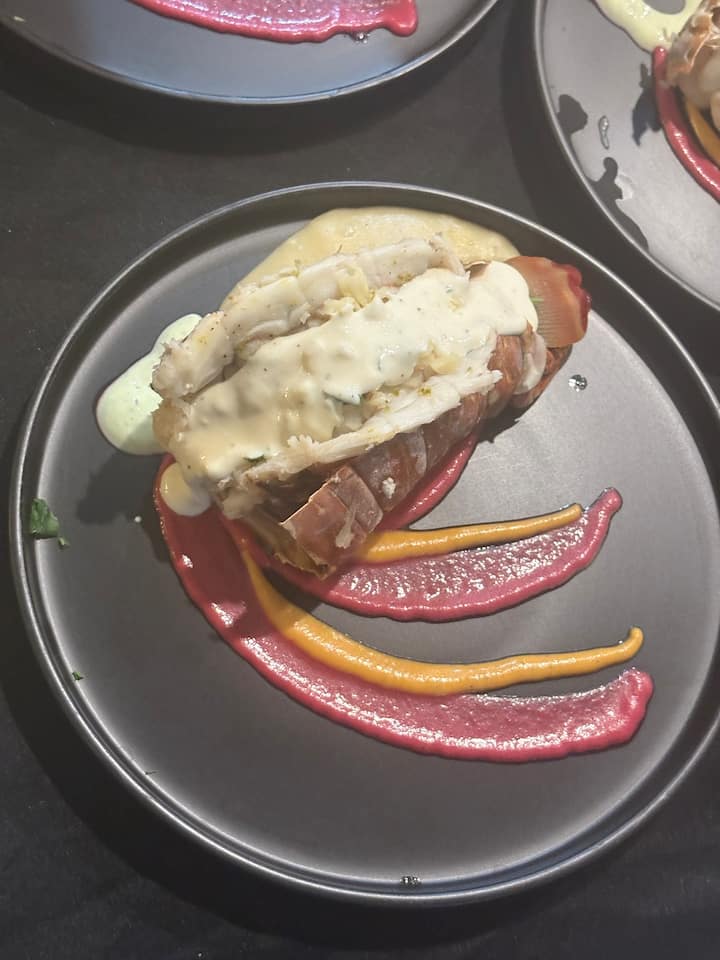 海鲜菜单:油、胡椒和酸橙腌制的烟熏三文鱼,配帕尔马干酪;炖贻贝、柠檬黄油扇贝和酸橙欧芹章鱼面包片。 海鲜意大利面,配虾、扇贝、鱿鱼、小章鱼和龙虾。 龙虾配甜菜根和胡萝卜酱、土豆泥。 牛柳配胡椒咖喱酱和地中海蔬菜。 甜点:芝士蛋糕、巧克力慕斯、提拉米苏或焦糖布丁。