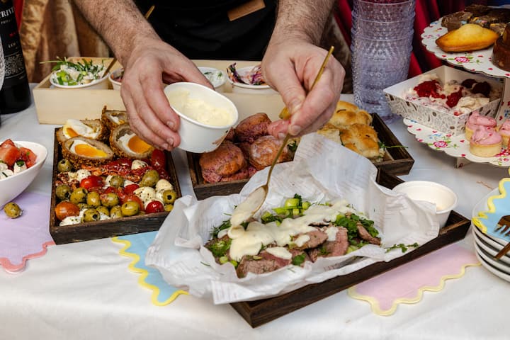 三明治:鸡蛋蛋黄酱、奶油奶酪和黄瓜、加冕鸡肉和香肠卷、奶酪和洋葱馅饼