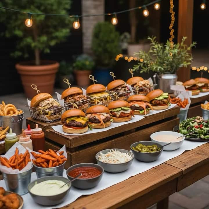 多汁的碎牛肉饼、融化的美式奶酪、酥脆的边缘、新鲜的配料,搭配烤面包。 搭配金黄薯条、脆皮球芽甘蓝泡菜和秘制酱汁。适合儿童,可根据需要进行调整!