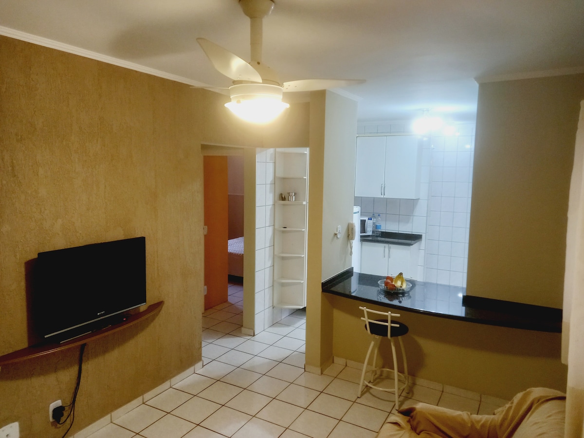 Apartamento completo, acomoda confortávelmente até 2 pessoas. Possui um quarto com cama queen, ar condicionado, espaço " home office", closet. Banheiro privativo, cozinha completa. TV a cabo na sal , e Wi-Fi incluso. Condomínio com portaria 24 horas, piscina, academia e lavanderia para uso gratuito. Uma vaga de garagem coberta inclusa. Localização próxima ao centro, supermercado, farmácia e restaurantes. Toalhas, roupa de cama, cobertas e travesseiros estarão disponíveis. Vizinhança tranquila.