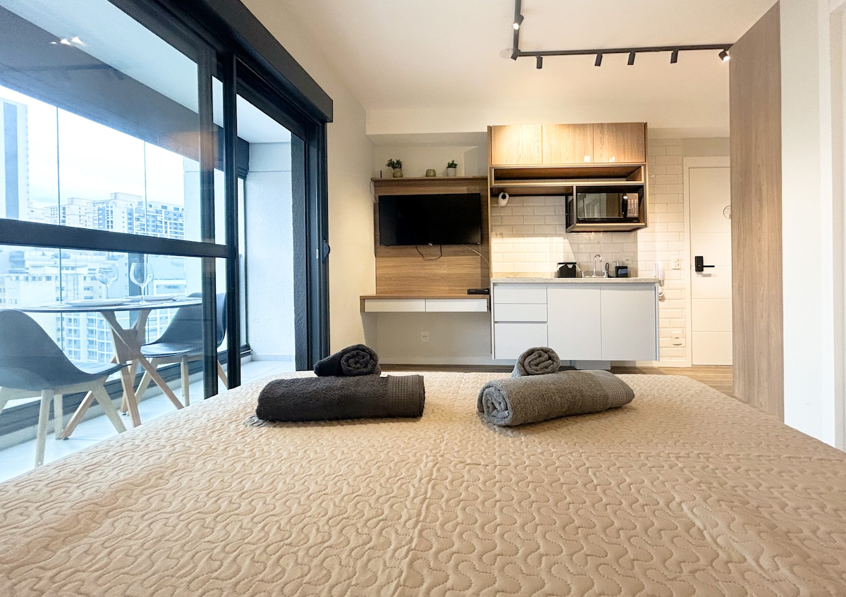 Welcome and make yourselves at home. The apartment is brand new, designed especially for you and has impeccable decor, very practical for everyday life. The view is spectacular! The apartment is on the 28th floor. We are in an excellent location in São Paulo, in the Pinheiros neighborhood, with restaurants, supermarkets and bakeries very close by. It's 40m2 (430 sqft) with 1 bedroom and 1 bathroom. Walking distance from Fradique Coutinho subway station (just 2 blocks).