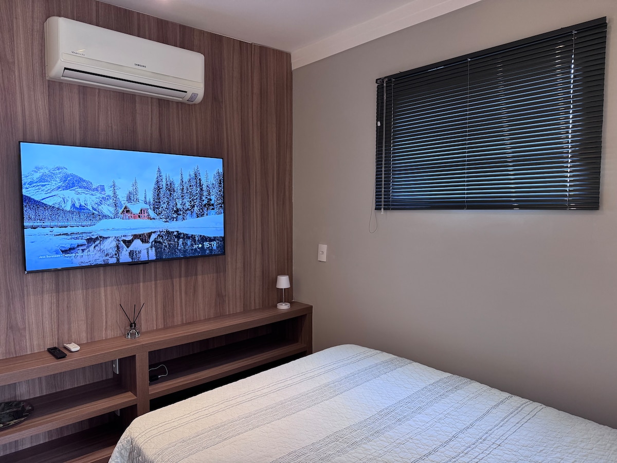 Studio apartment in an 18-story building, fully furnished, in the heart of Piracicaba, with 1 covered parking space, piped gas, water filter, appliances, intercom, 24-hour concierge, Wi-Fi, 50-inch Smart TV, electronic lock, security, and discretion. Close to markets, banks, bakeries, restaurants, churches, and shopping. Accommodates two guests with a double bed and an extra single mattress for a child. Small pets are welcome.
