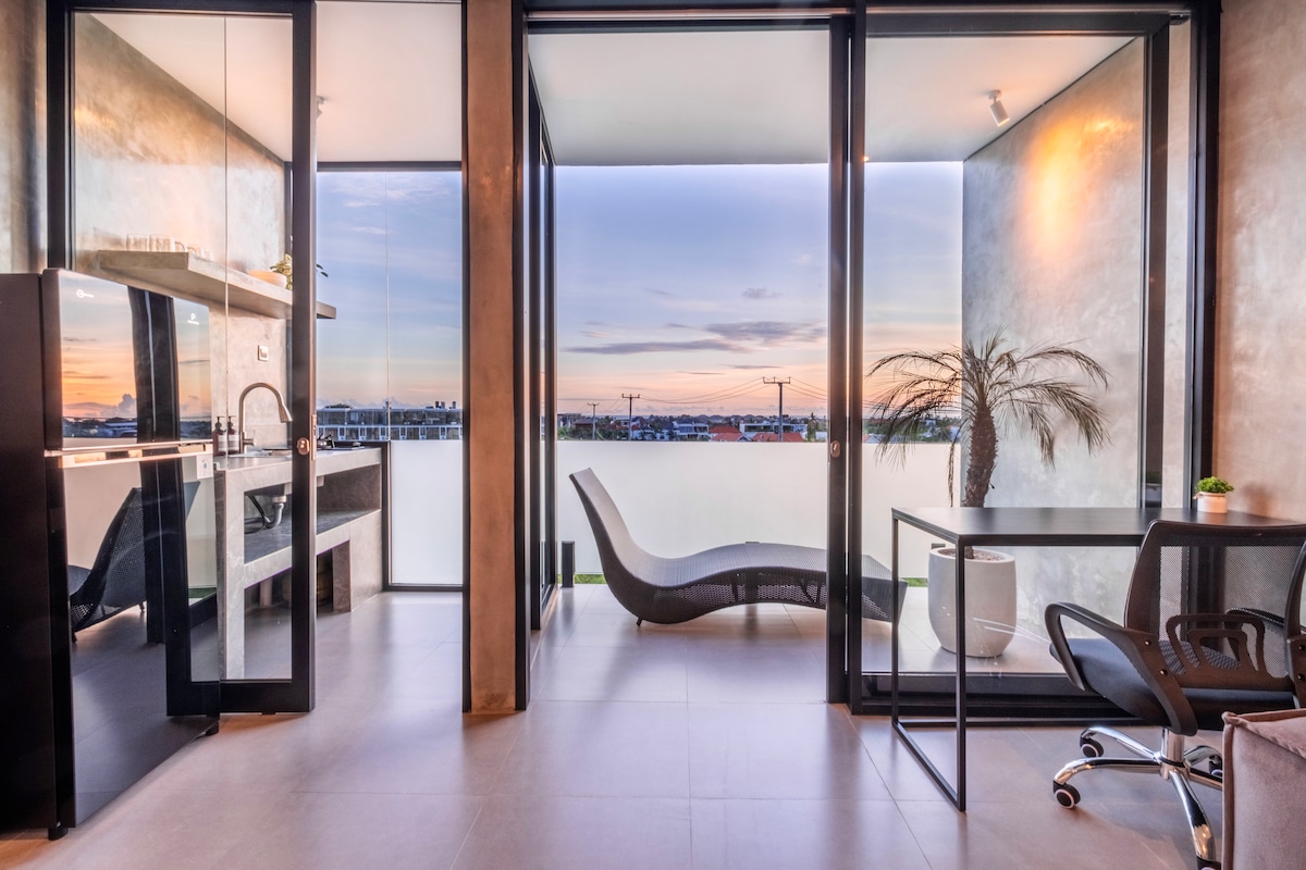 Stay in a modern Japandi-style [1] studio apartment [size: 28m2] with direct pool access in the heart of Pererenan. Thoughtfully designed for work and relaxation, this cozy space features an ensuite bathroom, kitchenette, sofa, and smart TV. Work remotely in the shared co-working space with ergonomic desks, monitors & meeting rooms, then enjoy the rooftop terrace & 12m pool. Walk to top cafés, gyms, and the beach. Daily housekeeping included!
