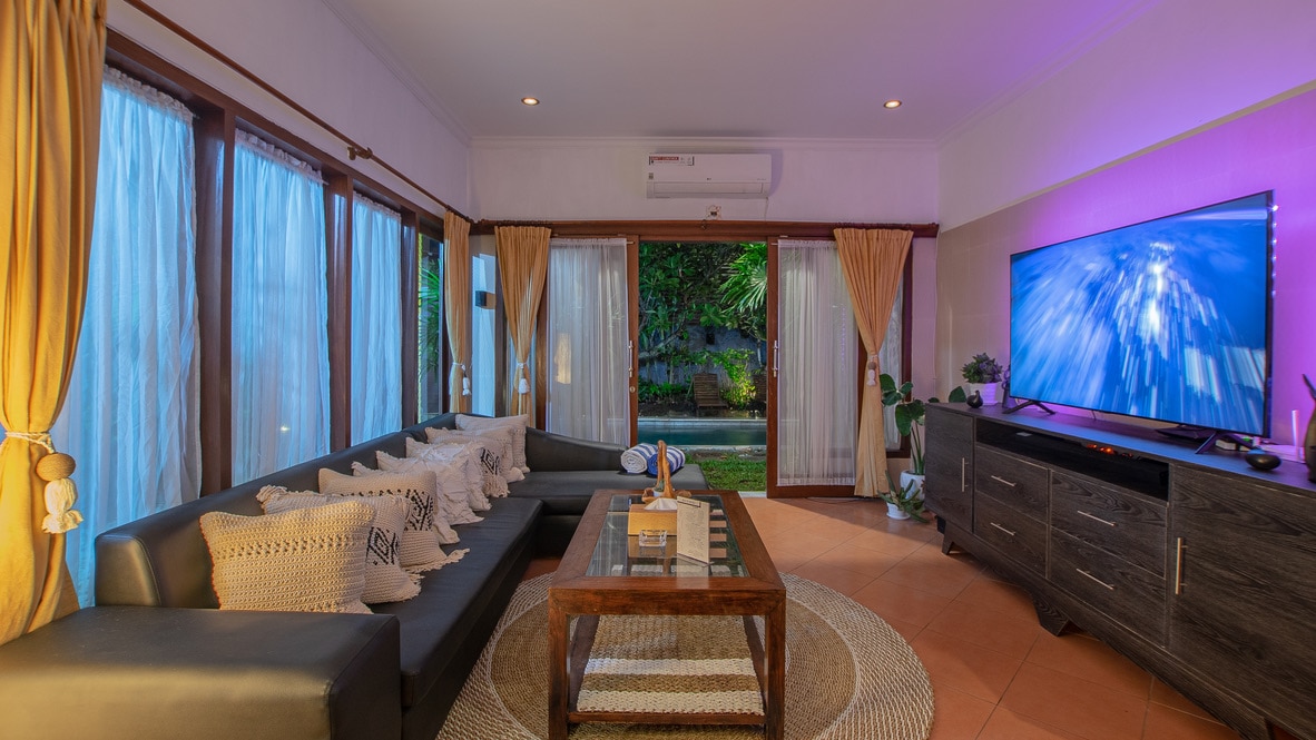 Situated in a quiet private gang in the heart of Canggu, 600 meters from the beach, walking distance to gyms, cafes, padel courts, spas, shops, clubs and world infamous shortcut, this 2 bedrooms Villa offers an enclosed living room and kitchen, a patio overlooking the pool and its magical garden, 2 bedrooms each with its own private outdoor bathroom. A/C and fast wifi available in all rooms.