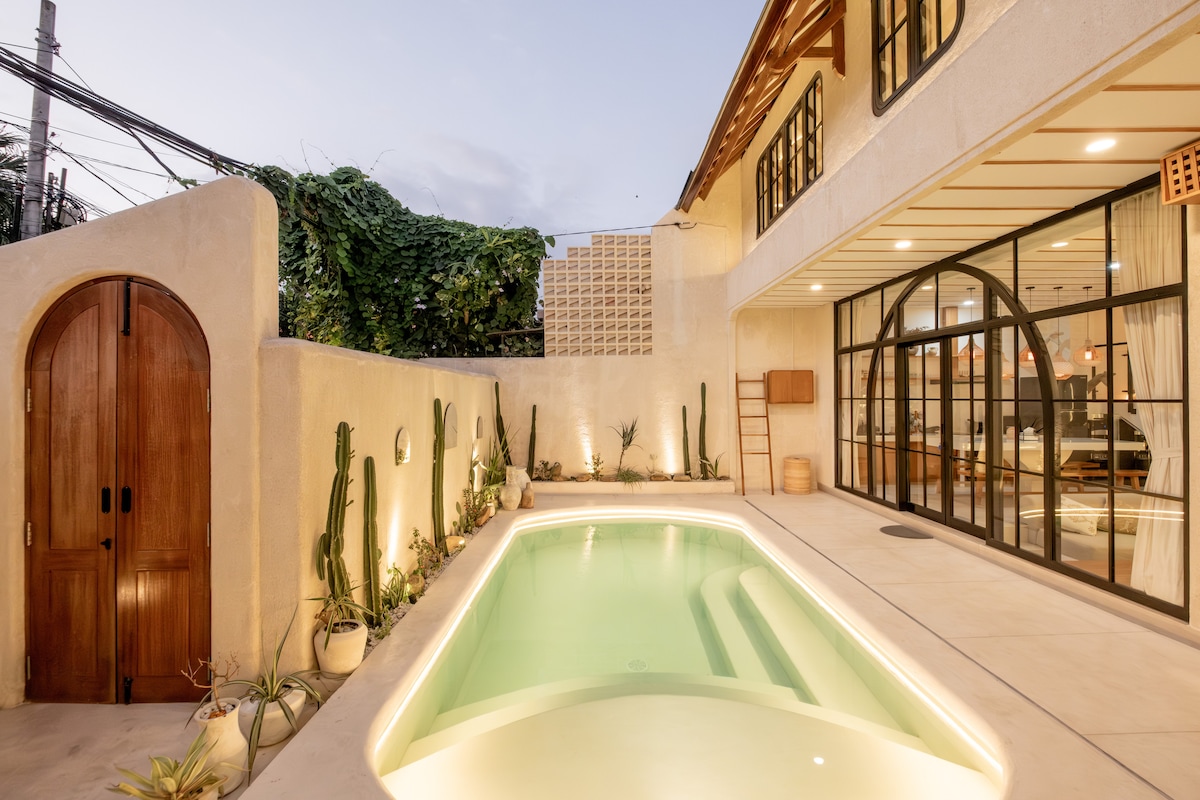 Discover a charming tropical escape at Casa Pumara, a stylish mezzanine villa with your own private plunge pool. Designed with warm natural wood, elegant arches, and beautiful natural light, the space offers a cozy yet sophisticated atmosphere. Relax on the swing, unwind in the sunken living room, or enjoy a peaceful moment by the pool surrounded by tropical greenery. Perfect for couples or travelers looking for a unique and relaxing Bali stay, conveniently located near Kerobokan and denpasar.