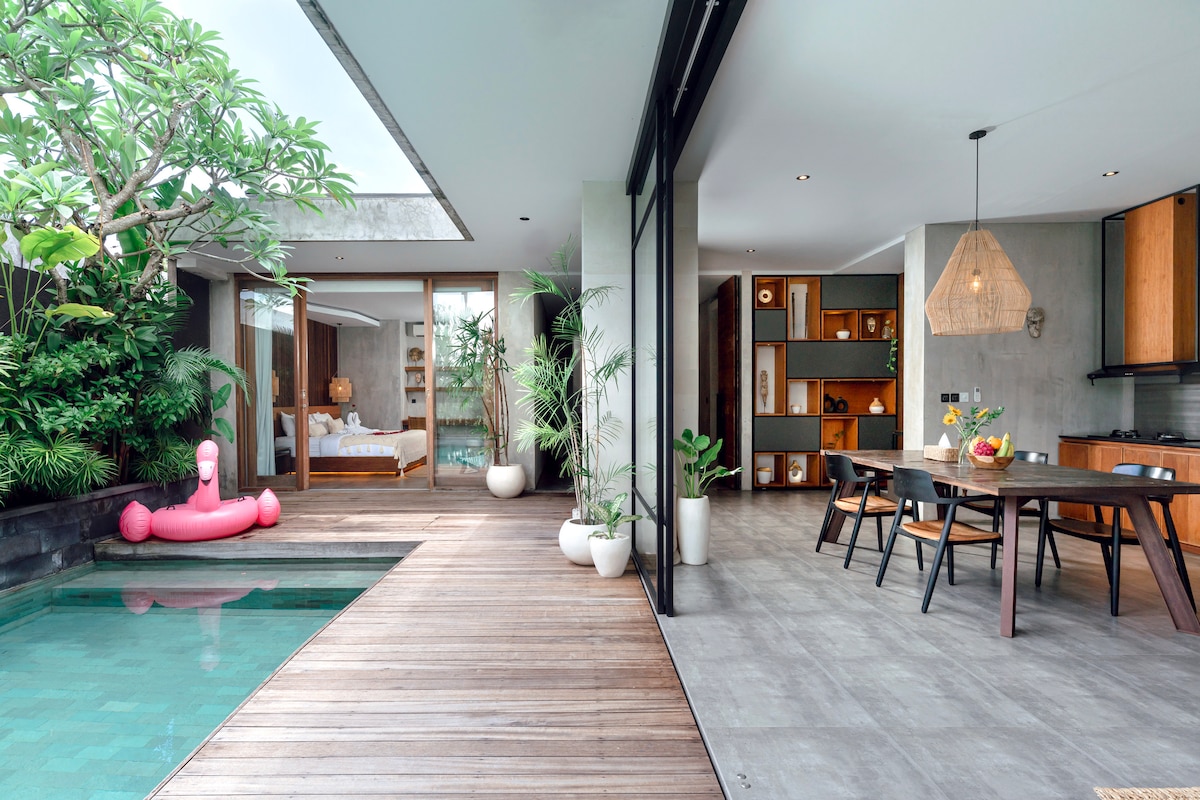 Enjoy your romantic private times in a luxurious complex, close to a fine selection of world-class cafes, restaurants and beach clubs. But perfectly hidden in a serene and quiet villa neighbourhood. This villa features an ensuite bathtub and offers a perfect dip-in pool. Enjoy your floating breakfast under the wood panels with sunlight gently pouring through. Chillax on the bean bag or sun loungers at your choice while soaking up the view of the garden.