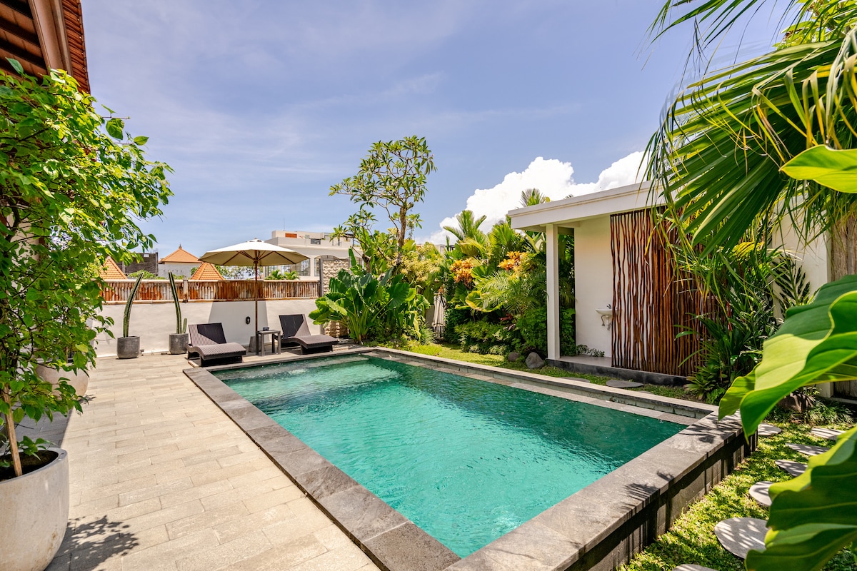 Welcome to our luxury villa in the heart of Canggu, just 500m from the beach and surrounded by 30+ cafés and restaurants within walking distance. Enjoy carefree days with your private pool, tropical garden and daily cleaning. Everything is arranged for comfort: ✔ Private pool ✔ Daily cleaning ✔ Beach & bath towels included ✔ Fresh drinking water dispenser ✔ Skylight bathtub ✔ Tropical bedroom view ✔ Fully equipped kitchen ✔ Fast WiFi ✔ Smart TV ✔ 40+ restaurants within walking distance