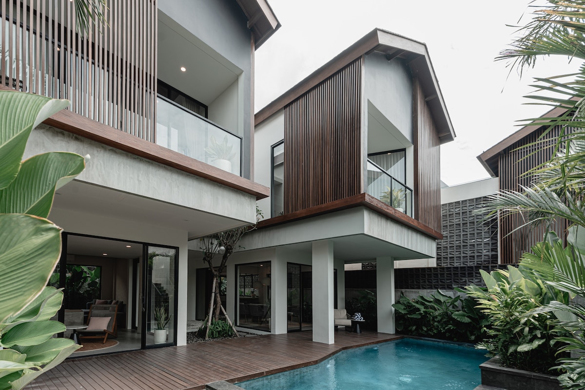 New Modern & Esthetic Villa Curved edges, rounded arches, white cool vibes, warm wood accents & lush greenery. This villa is designed, built and maintained with care so you will have a comfortable stay in style. Enjoy your stay in a peace & quiet neighborhood located strategically in center of Canggu: - 5 mins walk to Nelayan Beach for surf & sunset - 2-5 mins stroll to hip eateries, gym, massage, manicure - 7-10 mins stroll to Batu Bolong Beach road for more food & entertainment
