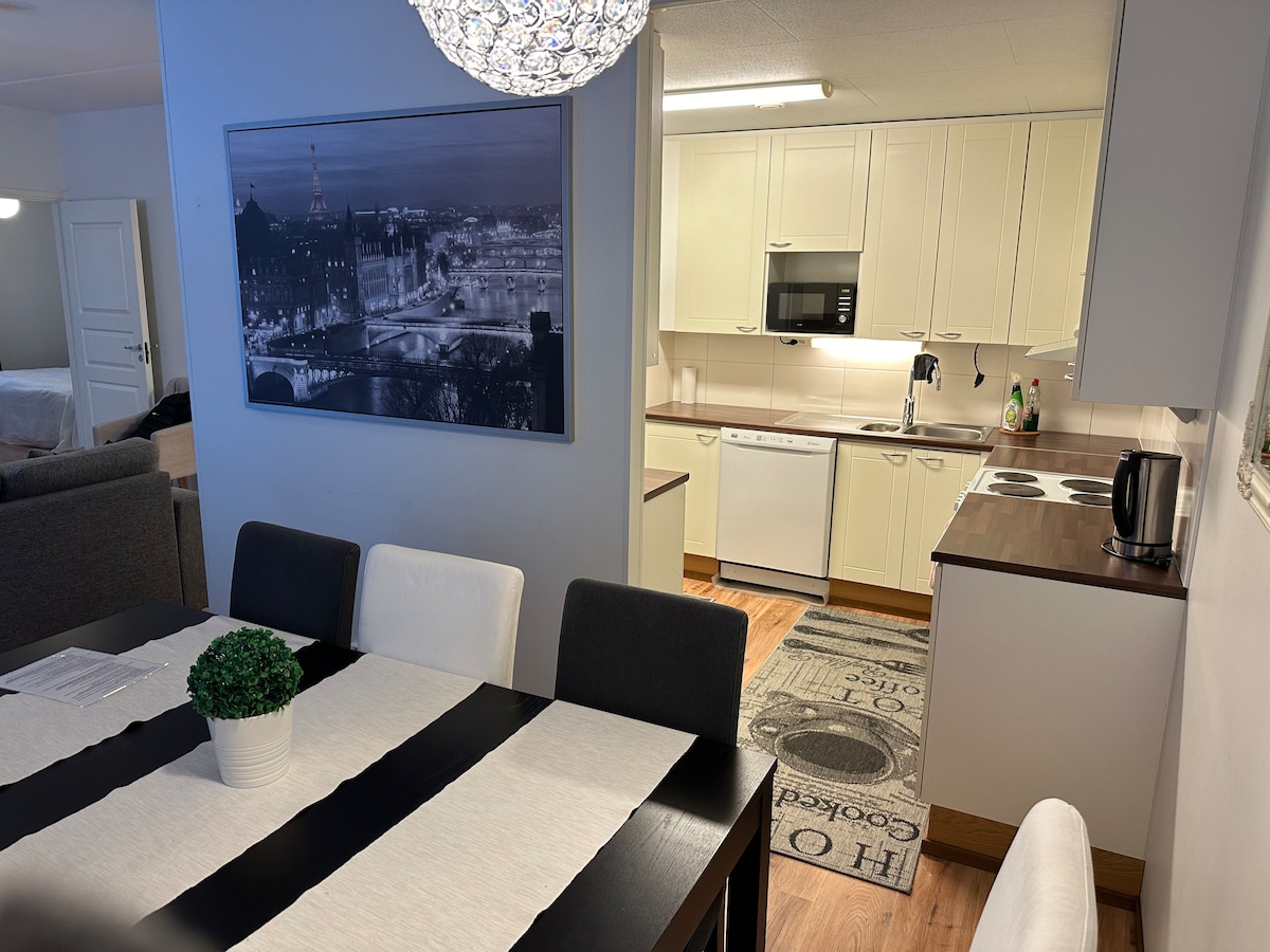 Viihtyisä vasta remontoitu huoneisto siistissä, rauhallisessa taloyhtiössä. Makuuhuoneessa on parisänky ja nojatuoli, josta saa levitettyä vuoteen, petivaatteet, pyyhkeet. Kylpyhuone/wc, jossa on pyykinpesukone. Pieni keittiö, jossa on kahvinkeitin, vedenkeitin, leivänpaahdin, mikro, uuni, jääkaappi pakastelokerolla. Keittiössä on tarjolla kahvia ja teetä. Olohuoneessa sohva 186cm, jossa on lisävuode mahdollisuus, tv. Lasitettu parveke. Oma autopaikka lämmityspistokkeella sisäpihalla.