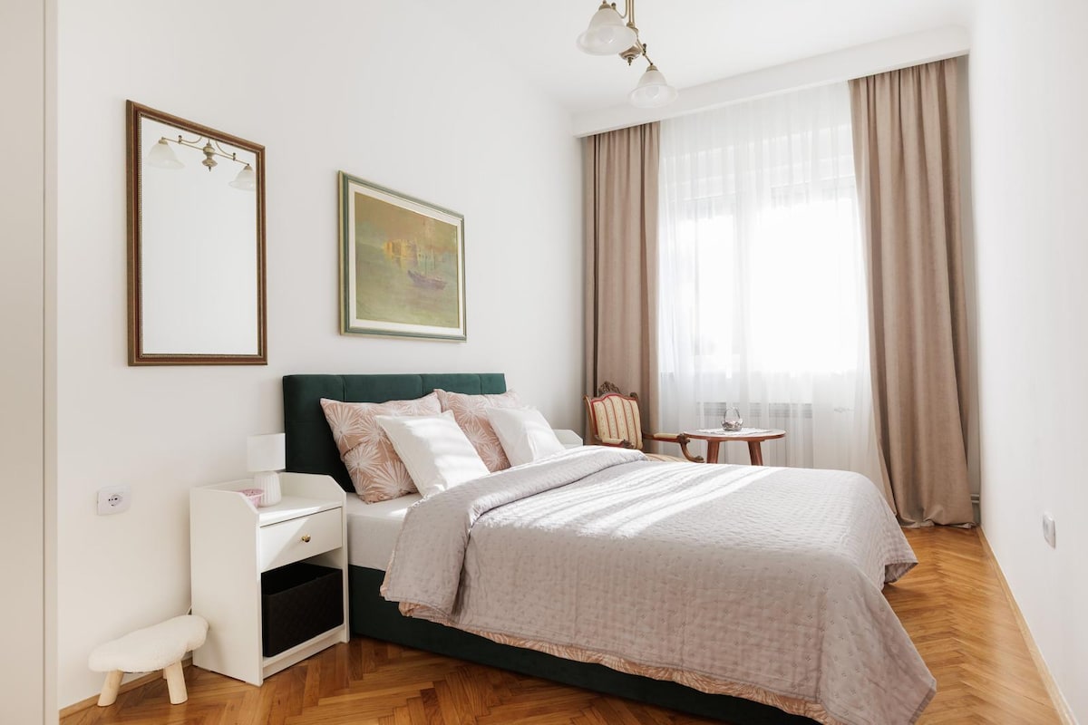 Apartment 'BELLA' is newly renovated spacious 70 m2 apartment on the first floor for up to 5 people (4+1). Apartment has two big bedrooms with double beds, bathroom and a toilet and a fully equipped kitchen + living room with sofa (for a fifth guest) that has a little balcony. We are located 4 minutes walk from the main square and 2 minutes from park Zrinjevac. We can check you in or send you self check in instructions.