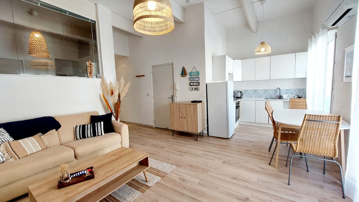 ⛵ Enjoy Sète's climate and atmosphere by staying in this charming apartment. 🐟 On the third floor of a recent building with elevator and secure basement parking. This bright apartment features a large living room with open kitchen, a bedroom with queen-size bed and storage space, a loggia, balcony, shower and separate toilet. Located just a five-minute walk from the town center and buses to the beach. In the immediate surroundings: supermarket, pharmacy and restaurants. Enjoy your stay!