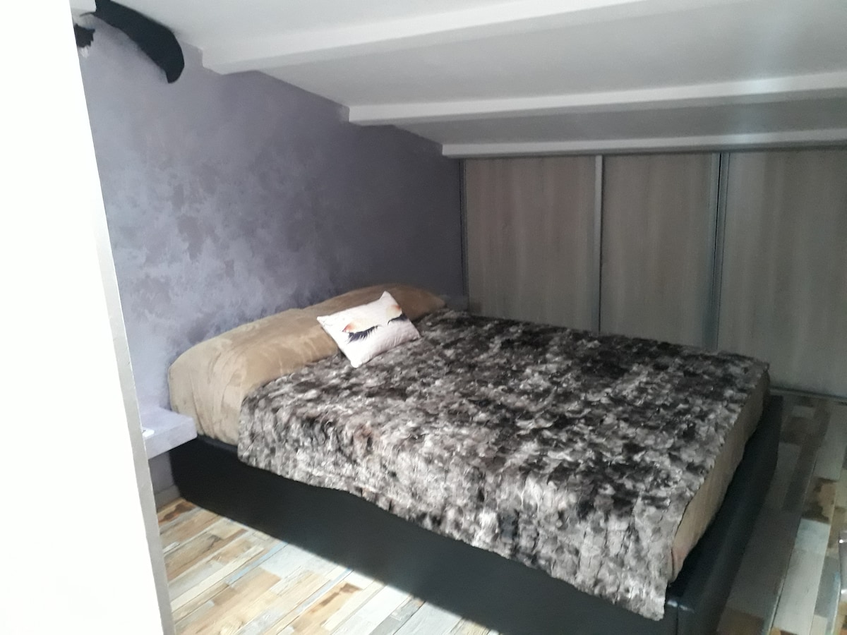 Chambre/sdb, WIFI. Entrée indépendante. Pièce unique : coin table/fauteuils qui peut être remplacé par bureau sur demande, TV, bouilloire, machine Nespresso, réfrigérateur top, capsules nespresso, thé, lit 140x200 pour 1 ou 2 adultes. Etage mezzanine avec matelas mousse 130 pour 1 ou 2 enfants jusque 12ans limite max. (hauteur de plafond de 1m50). Linge de lit et bain à disposition (gratuit). Sdb privative (lavabo,douche, WC). Horaires: 19:00/12h00. Ne pas réserver si Espace Sentein.