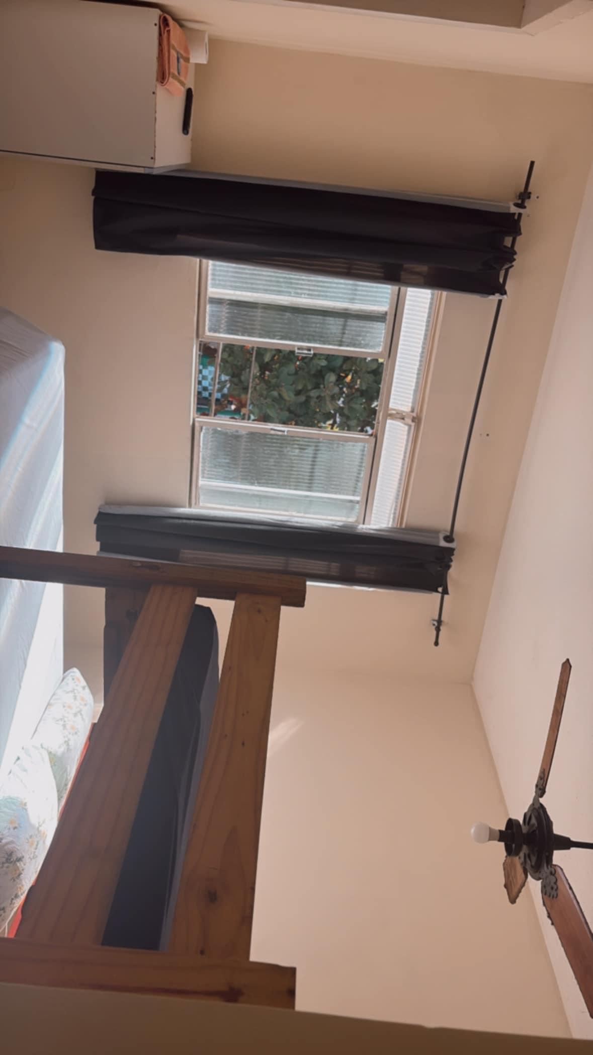 apartamento com 1 cama de casal no ar condicionado e 2 cama de solteiro no ventilador de teto.
