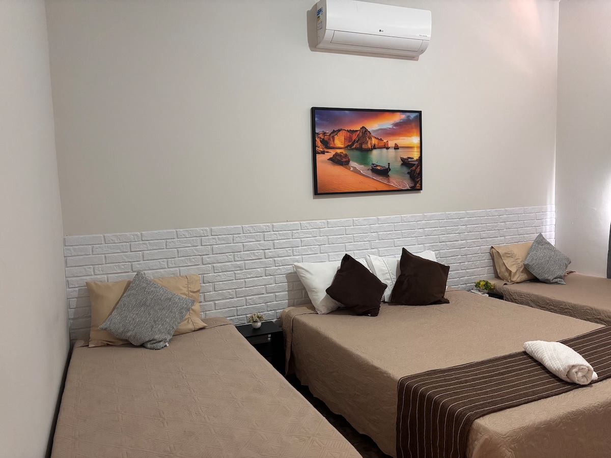 Ambiente familiar, ideal para viajantes da BR 040, ou quem está a trabalho na cidade. Quarto quádruplo de 18m² com cama de casal e duas de solteiro. Equipado com ar-condicionado, Smart TV, frigobar e banheiro privativo. Localizado no 2 piso. Localização estratégica: a 450m da BR-040, próximo às principais empresas do polo industrial e a apenas 2 km do shopping. Perfeito para famílias, grupos e profissionais a trabalho. PROIBIDO FUMAR NA SUÍTE.
