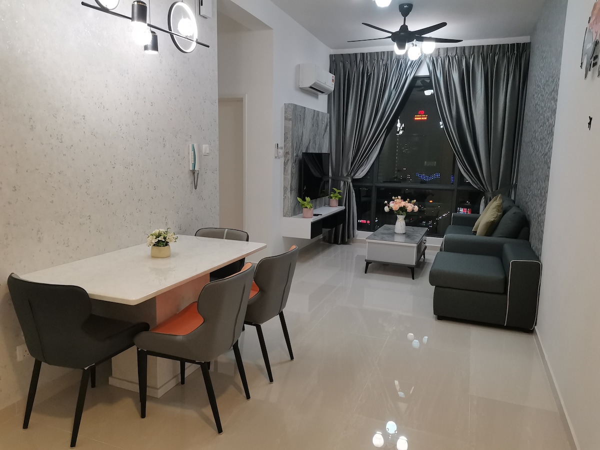 (1+1 BR & 1 bathroom) Contemporary modern and cozy condo in the heart of JB city centre. Suitable for 4pax family, friends and business group. **5mins to CIQ, City Square, KSL, Pelangi, and Larkin **8mins to Mid Valley Southkey, Larkin Sentral and Sentosa **15 mins drive to Paradigm mall, Sutera, Skudai and Mount Austin ✔ 4K SmartTV ✔ High Speed Wi-Fi, working tables with extension plug ✔ Washer ✔ Airconds in every rooms. ✔ Atari console, Mahjong, and Board games. ✔ FREE parking for 1 car