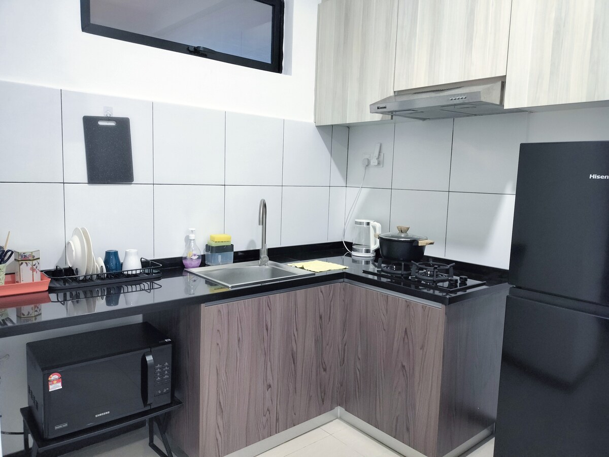 This is a spacious 2Bedroom unit perfectly fit for guests up to 5 pax with total of 1 king size bed 1 queen size bed 1 single bed High floor with high view. 1. Basketball Court 1. Gym Room 2. Function Hall 3. Lounge 4. Library 5. Manicure Shop 6. Mini Theatre 7. BBQ Deck 8. Swimming Pool 9. Sauna 10. Jacuzzi 11. Game room (Pool Table, PS Room, Darts and more) 12. Laundry 13. Mini Market -Sky Garden Guest are not allow to smoke in the room , please smoke at the balcony if needed
